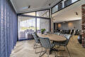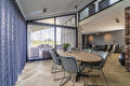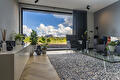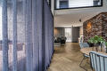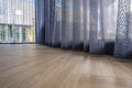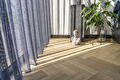 Maar dat was nog niet alles. Het raam in de woonkamer had een nogal ongebruikelijke vorm, en daarom hadden ze aanvankelijk geen raambekleding gepland. Uiteindelijk besloten ze echter om toch terug te komen om te zien wat we konden doen. We hebben samen met hen nagedacht over de gordijnen en welke kleur ze wilden. Ze wilden graag iets blauws, maar niet te polyester-achtig. We vonden de perfecte oplossing met mooie open geweven gordijnen die de ruimte een natuurlijke uitstraling gaven. Het blauw in het licht was echt adembenemend. Het materiaal is een mix van polyester en acryl met een mesh structuur, wat het een natuurlijke uitstraling geeft. Overdag kunnen ze naar buiten kijken en genieten van het uitzicht op het meertje.
