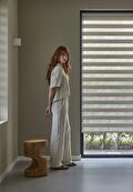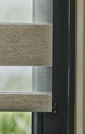 Duo-rolgordijnen combineren transparante en dichte banen stof in één systeem. Door deze langs elkaar te bewegen ontstaat er een speels, maar gecontroleerd effect van licht en privacy.